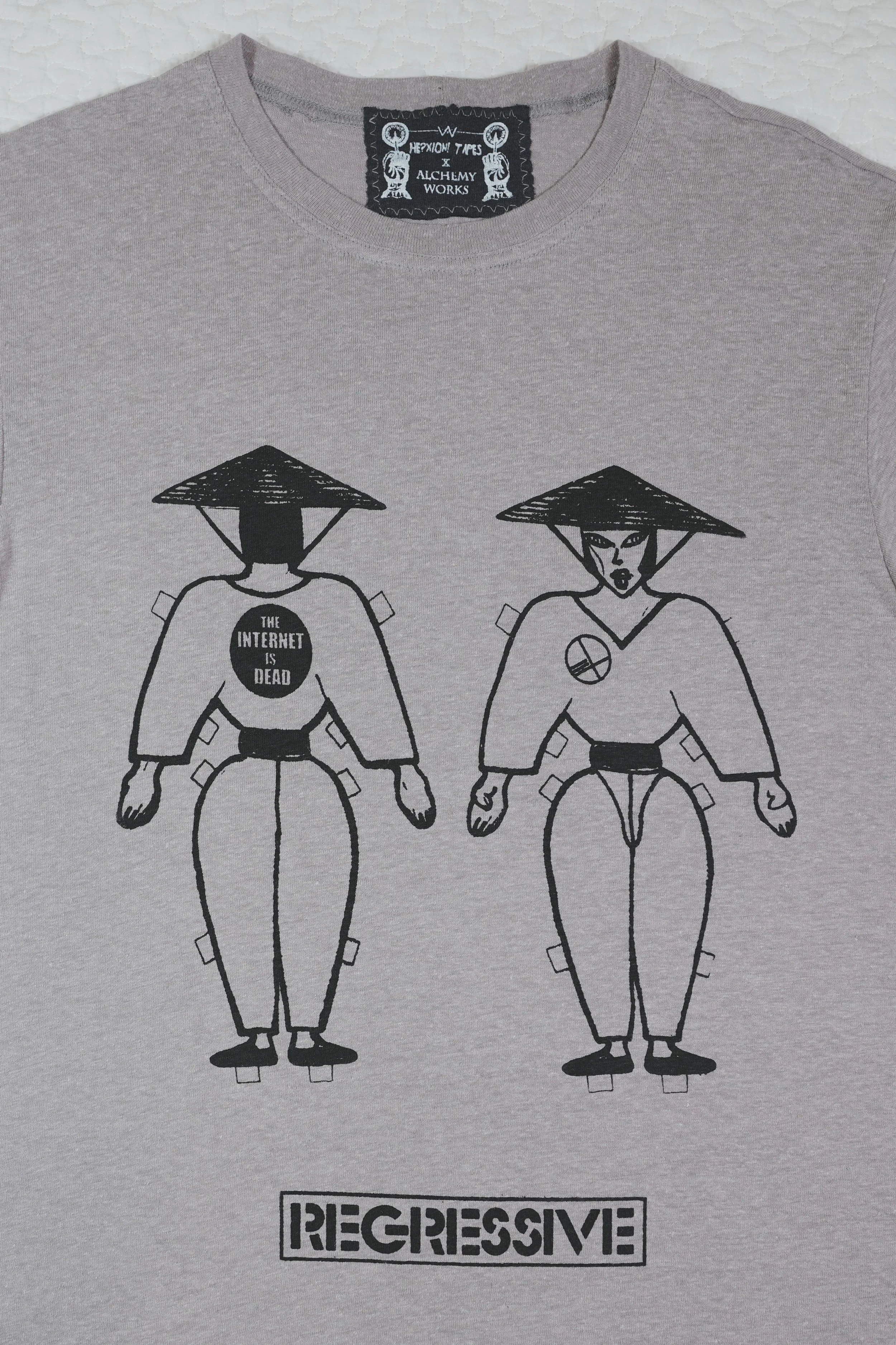 Alchemy Works is our platform for artistic collaborations—where textile meets expression. This edition features original artwork by He?XION!TAPES, a multidisciplinary label led by the founding duo of ANTIBODIESCollective, known for its striking visual language and socially conscious narratives.