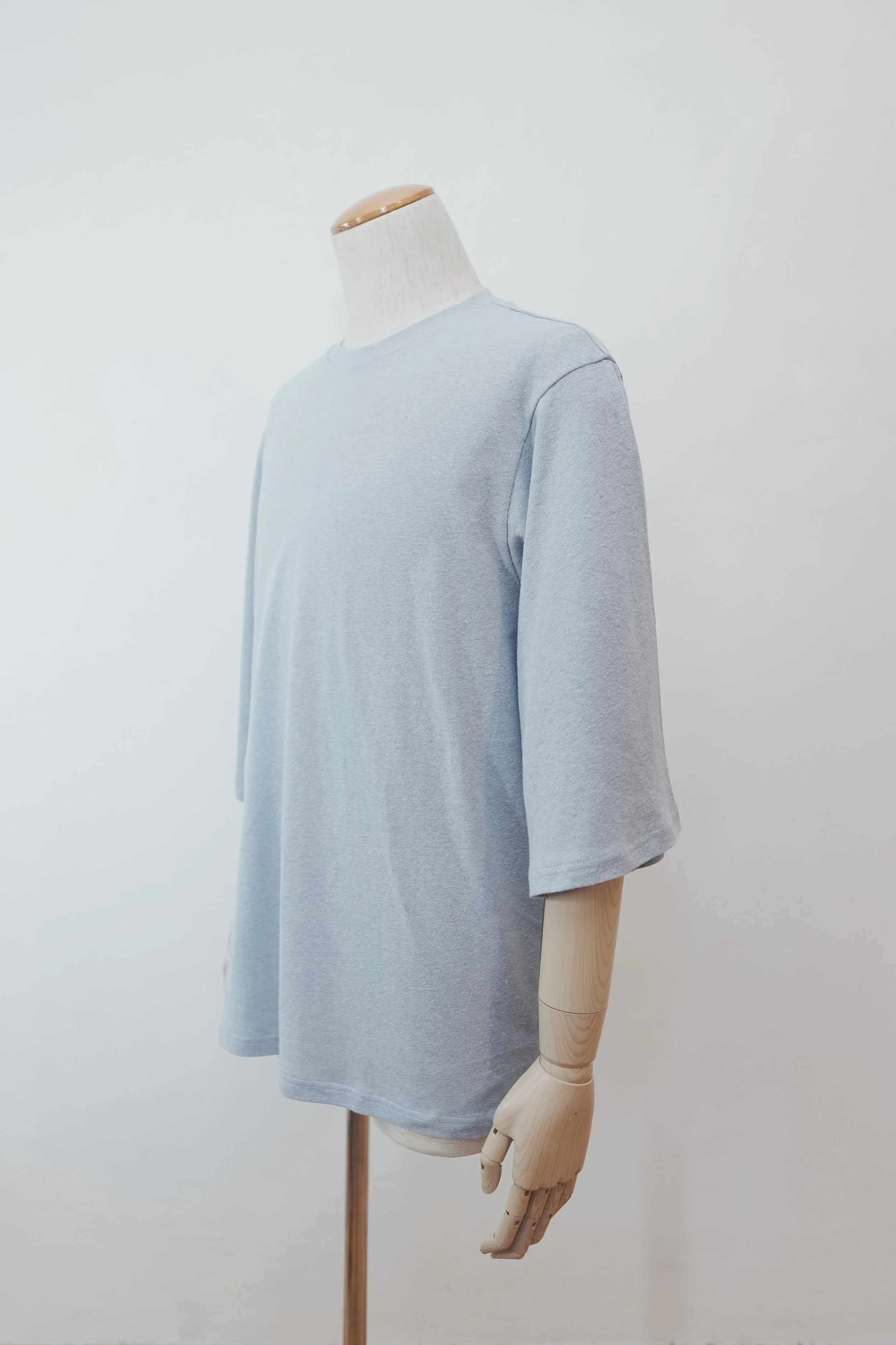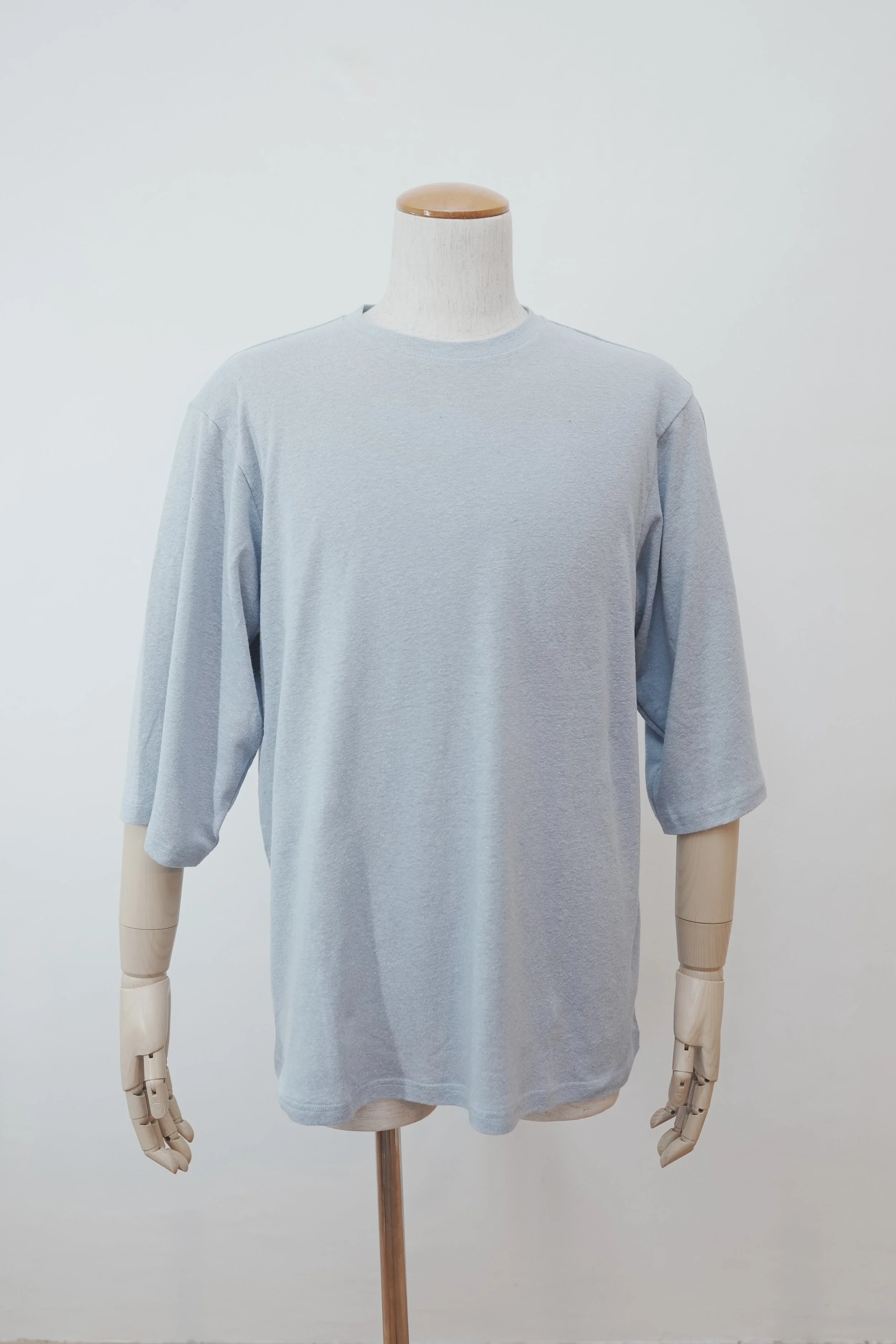 ヘンプ55%コットン45%混紡の日本国内で編み立てられた60/1の天竺。薄手でサラッとした肌離れの良いリラックスした表情の生地で、肌に優しく馴染み、デイリーユースに最適です。